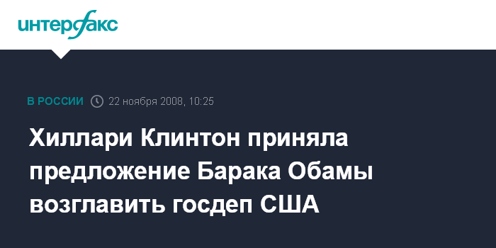 Москва. 22 ноября. INTERFAX.RU - Сенатор от штата Нью-Йорк Хиллари Клинтон приняла предложение избранного президента США Барака Обамы возглавить государственный департамент, сообщила радиостанция Нэшнл Паблик Радио со ссылкой на источник в переходной команде Б.Обамы.