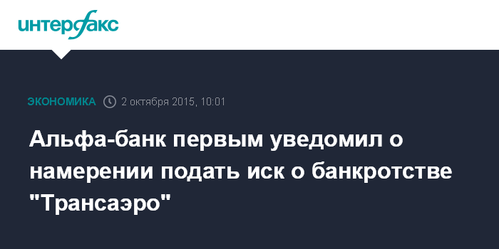 Москва. 2 октября. INTERFAX.RU – Альфа-банк подал уведомление о намерении обратиться в арбитражный суд с заявлением о признании "Трансаэро" банкротом. Соответствующая информация размещена в Едином федеральном реестре сведений о фактах деятельности юрлиц.