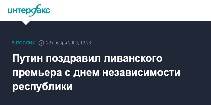 В телеграмме премьера, в частности, говорится: "Убежден, что отношения дружбы и сотрудничества между Россией и Ливаном будут и далее развиваться на благо наших народов, в интересах мира и стабильности на Ближнем Востоке". В этом году Ливанская Республика отмечает 65-ую годовщину провозглашения независимости.