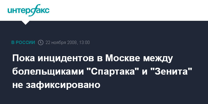 Москва. 22 ноября. INTERFAX.RU - За час с небольшим до матча футбольных команд "Спартак" (Москва) и "Зенит (Санкт-Петербург) никаких инцидентов между болельщиками зафиксировано не было, сообщили "Интерфаксу" в Управлении информации и общественных связей ГУВД Москвы.