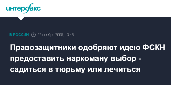 Москва. 22 ноября. INTERFAX.RU - Правозащитники поддержали инициативу Федеральной службы РФ по наркоконтролю (ФСКH) ввести альтернативное лечение для наркоманов, предполагающее для наркозависимого нарушителя возможность выбора - идти в тюрьму или лечиться.