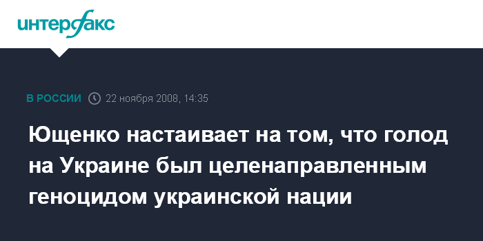 Москва. 22 ноября. INTERFAX.RU - Президент Украины Виктор Ющенко называет голод на Украине 1932-33 годов одной из наиболее масштабных гуманитарных катастроф в мире и вновь подчеркивает, что это был геноцид украинской нации, организованный тоталитарным коммунистическим режимом.