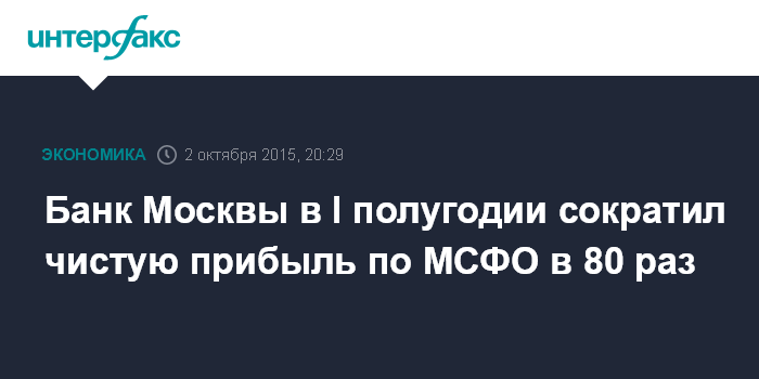 Москва. 2 октября. INTERFAX.RU - Банк Москвы в первом полугодии 2015 года сократил чистую прибыль по МСФО до 200 млн рублей по сравнению с 16 млрд рублей годом ранее, свидетельствует консолидированная отчетность кредитной организации.