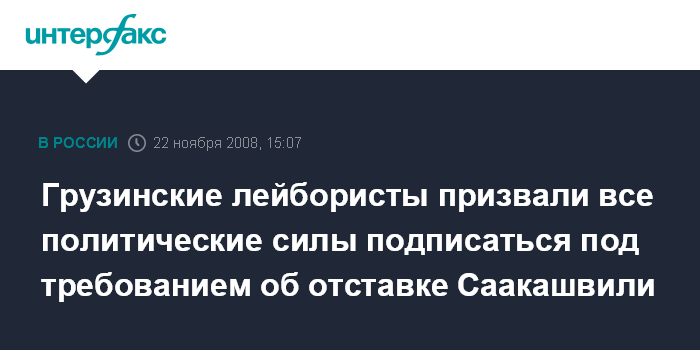 Москва. 22 ноября. INTERFAX.RU - Лейбористская партия Грузии обратилась к оппозиционным силам страны с инициативой подписать декларацию, первым пунктом которой будет требование об отставке президента Михаила Саакашвили.