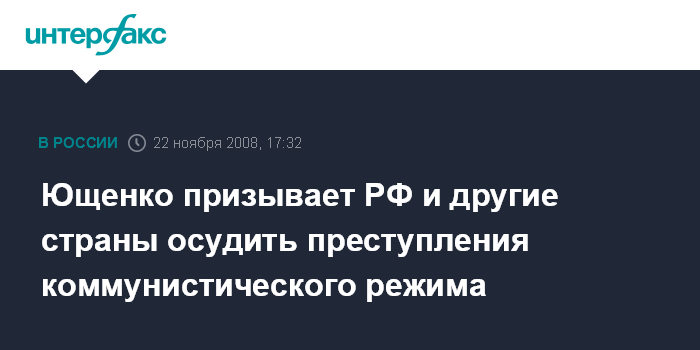 Москва. 22 ноября. INTERFAX.RU - Президент Украины Виктор Ющенко призывает Российскую Федерацию и другие государства осудить преступления коммунистического режима.