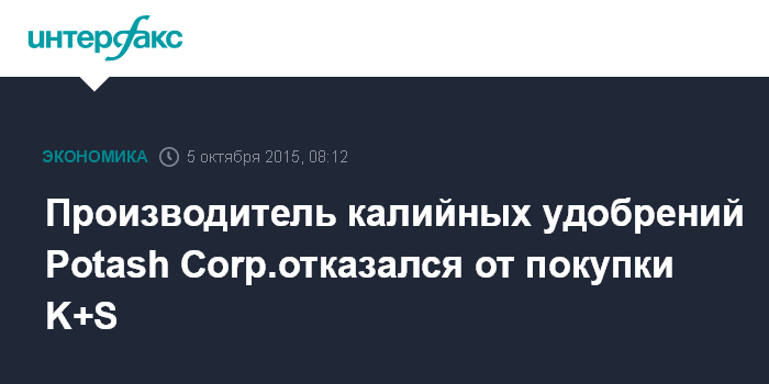 Москва. 5 октября. INTERFAX.RU – Канадская Potash Corp. of Saskatschewan отказалась от попыток покупки германского производителя удобрений K+S, указав на сложную рыночную конъюнктуру и отсутствие взаимодействия с менеджментом конкурента, сообщает The Wall Street Journal со ссылкой на заявление компании.