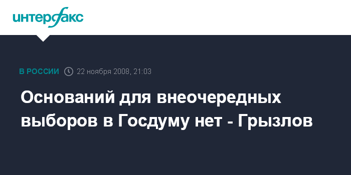 Москва. 22 ноября. ИНТЕРФАКС - Внеочередных выборов в Государственную Думу не будет, заявляет председатель Высшего совета партии "Единая Россия", председатель Госдумы Борис Грызлов.