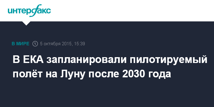 Москва. 5 октября. INTERFAX.RU - Миссия по исследованию поверхности Луны с участием людей начнётся не ранее 2030 года, считает представитель Европейского космического агентства (ЕКА) Джеймс Карпентер.