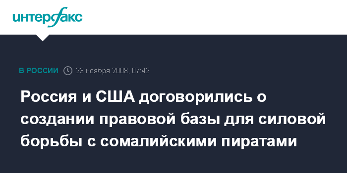Как сообщил журналистам помощник президент РФ Сергей Приходько, "оба президента договорились о необходимости начала работы в Совете безопасности ООН по созданию правовой базы для применения совместных силовых мер против сомалийских пиратов".