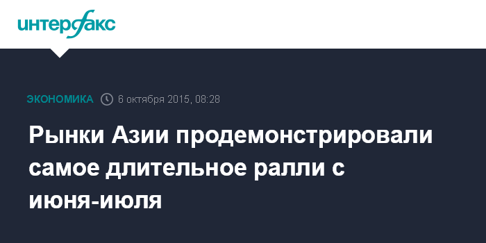 Москва. 6 октября. INTERFAX.RU – Фондовые индексы Азиатско-Тихоокеанского региона демонстрируют самый длительный непрерывный подъем за последние месяцы на фоне общемирового оптимизма, связанного с предполагаемым сохранением крайне мягкой денежно-кредитной политики в США и других странах, пишет Financial Times.