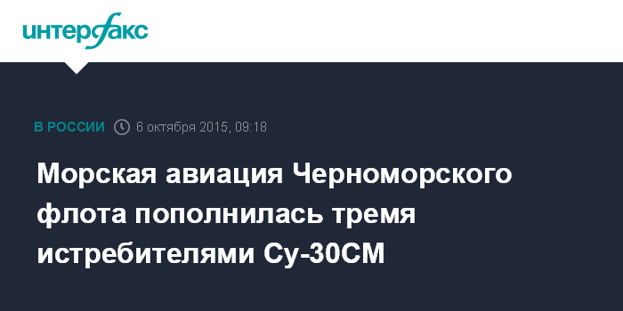 Москва. 6 октября. INTERFAX.RU - Состав отдельного морского штурмового авиационного полка Черноморского флота пополнился еще тремя многофункциональными истребителями СУ-30СМ, сообщил "Интерфаксу" во вторник начальник отдела информационного обеспечения ЧФ капитан первого ранга Вячеслав Трухачёв.