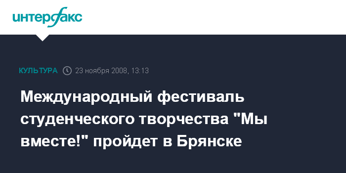 Брянск. 23 ноября. INTERFAX.RU - V Международный фестиваль студенческого творчества "Мы вместе" пройдет в Брянске 24-27 ноября, сообщили "Интерфаксу" в городской администрации.