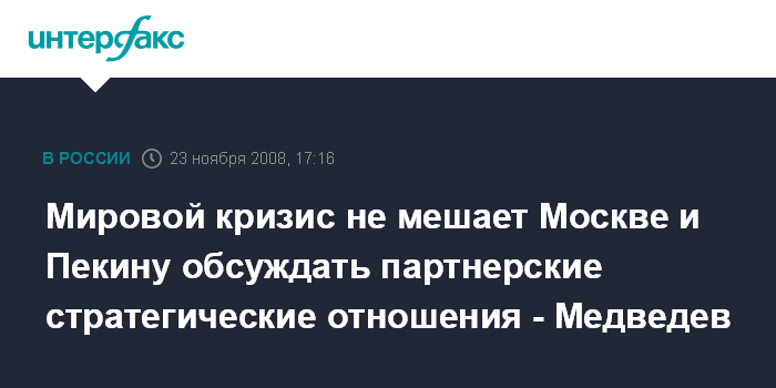 Д.Медведев отметил, что несмотря на то, что его последние встречи с Ху Цзиньтао проходят на фоне обсуждения кризисных явлений, это не мешает обеим сторонам "обсуждать полноценные партнерские стратегические отношения во всей их полноте", и данная беседа предоставляет дополнительную возможность для этого.