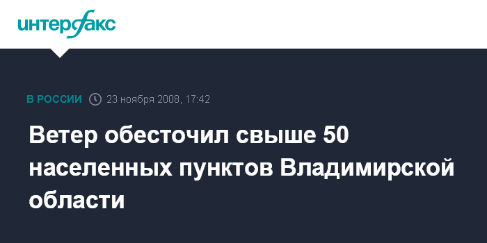 Владимир. 23 ноября. INTERFAX.RU - Из-за сильных порывов ветра в воскресенье во Владимирской области без света остались более 50 населенных пунктов в Кольчугинском, Киржачском и Александровском районах, сообщили "Интерфаксу" в пресс-службе главного управления МСЧ по области.