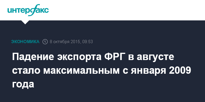 Москва. 8 октября. INTERFAX.RU – Объем германского экспорта в августе 2015 года снизился на 5,2% по сравнению с предыдущим месяцем - падение стало максимальным с января 2009 года, свидетельствуют данные Федерального статистического управления страны (Destatis).