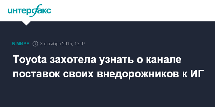 Москва. 8 октября. INTERFAX.RU - Компания Toyota заявила в четверг, что готова помочь США выяснить, каким образом внедорожники этой японской компании в столь большом количестве попали в руки "Исламского государства" (ИГ, организация запрещена в России).