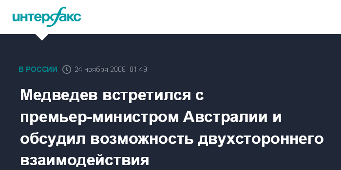 Премьер-министр Австралии в свою очередь поблагодарил Д.Медведева за конструктивное выступление на саммите АТЭС, которое касалось финансового кризиса, изменения климата и глобальных катастроф. К.Рад также сказал, что "отношения между Австралией и Россией развиваются динамично по многим областям, но мы также можем охватить еще многие области нашего сотрудничества".