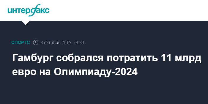 Москва. 8 октября. INTERFAX.RU - Проект бюджета на проведение летних Олимпийских игр 2024 года в Гамбурге, представленный бургомистром Олафом Шольцем в четверг, предусматривает затраты в размере 11,2 млрд евро, сообщает агентство DPA.