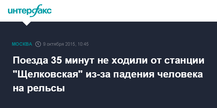 Москва. 9 октября. INTERFAX.RU - Движение поездов метро на станции "Щелковская" по направлению в центр прерывалось в пятницу из-за падения человека на пути, сообщили "Интерфаксу" в пресс-службе столичного главка полиции.