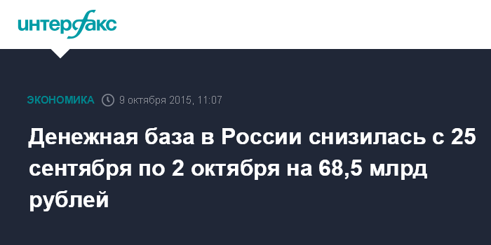 На 25 сентября денежная база в России равнялась 8045,5 млрд рублей. Таким образом, за период она снизилась на 0,85%, или на 68,5 млрд рублей.