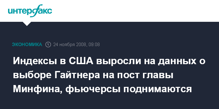 Москва. 24 ноября. INTERFAX.RU - Американские фондовые индексы выросли по итогам торгов в пятницу на информации о том, что избранный президент США Барак Обама, выбрал на пост главы Минфина Тимоти Гайтнера, который, возглавляя Федеральный резервный банк (ФРБ) Нью-Йорка, уже приобрел большой опыт в преодолении последствий кризиса, сообщает агентство Bloomberg. В понедельник фьючерсы на индексы поднялись к 8:27 мск на 0,7-1,5% благодаря информации о поддержке Citigroup правительством США.