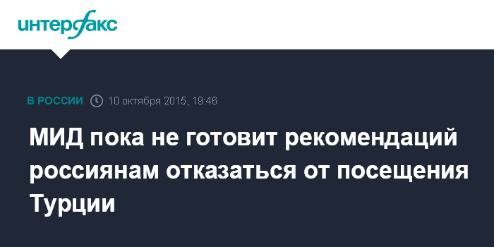 Москва. 10 октября. INTERFAX.RU - В МИД РФ опровергли информацию о том, что российское дипведомство планирует рекомендовать россиянам отказаться от посещения Турции в связи угрозой террористических атак.