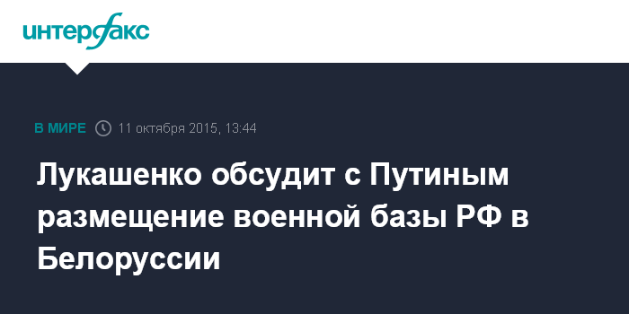 Москва. 11 октября. INTERFAX.RU - Президент Беларуси Александр Лукашенко вновь заявил, что не обсуждал размещение российской военной базы в республике с президентом России Владимиром Путиным. Вместе с тем, белорусский лидер сообщил, что намерен поднять данный вопрос в разговоре со своим российским коллегой в ближайшее время.
