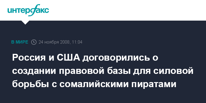Москва. 24 ноября. INTERFAX.RU - На встрече президентов Дмитрия Медведева и Джорджа Буша большое внимание уделялось совместным действиям в борьбе с пиратством, в том числе силовым.