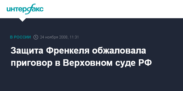 Москва. 24 ноября. INTERFAX.RU - Адвокаты банкира Алексея Френкеля, осужденного на 19 лет заключения за организацию убийства зампредседателя ЦБ РФ Андрея Козлова, обжаловали приговор в Верховном суде России.