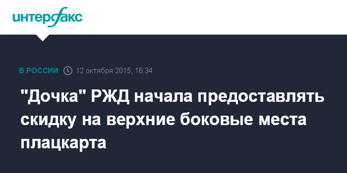 Москва. 12 октября. INTERFAX.RU - Проезд на верхних боковых местах в плацкартных вагонах поездов дальнего следования "дочки" ОАО "Российские железные дороги" (РЖД) - АО "Федеральная пассажирская компания" (ФПК) - с понедельника стоит на 30% дешевле.