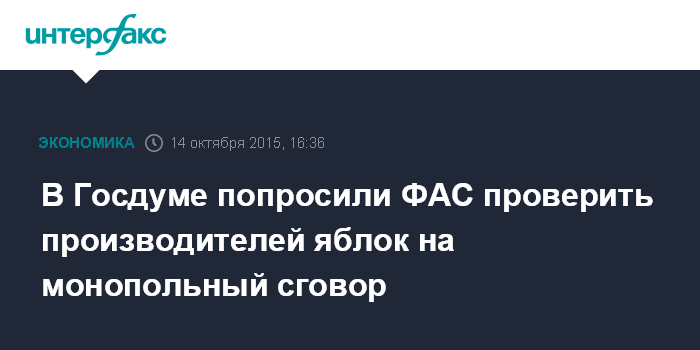 Москва. 14 октября. INTERFAX.RU – Член комитета Госдумы по аграрным вопросам Светлана Максимова обратилась к руководителю ФАС Игорю Артемьеву с просьбой проверить отечественных производителей яблок на предмет монопольного сговора в связи с сообщениями о резком росте цен на эту продукцию, сообщила пресс-служба думского комитета.