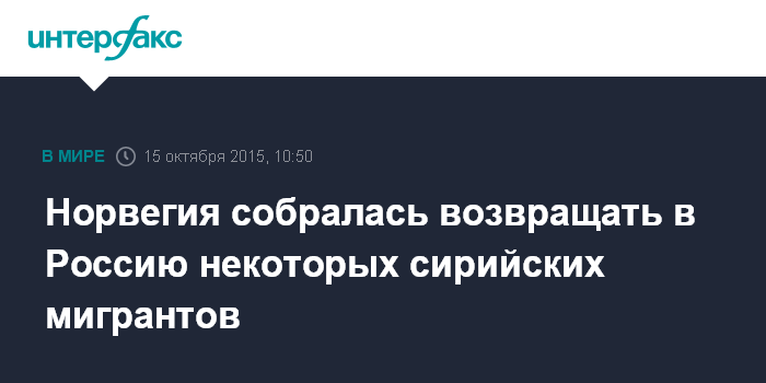 Москва. 15 октября. INTERFAX.RU - Норвежские власти со следующей недели намерены начать высылать в РФ выходцев из Сирии, приезжающих в королевство из России, если до иммиграции они уже некоторое время жили на российской территории, сообщает в четверг британское издание The Daily Mail.