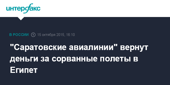 Москва. 15 октября. INTERFAX.RU - Авиакомпания "Саратовские авиалинии" вернет деньги туристам, купившим туры в Египет с датой вылета после 24 октября, говорится в официальном сообщении перевозчика.
