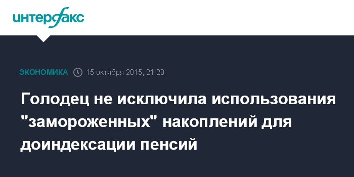 Москва. 15 октября. INTERFAX.RU - Вице-премьер России Ольга Голодец не исключает использование резерва "замороженных" пенсионных накоплений в размере 342 млрд рублей для дополнительной индексации пенсий в 2016 году.