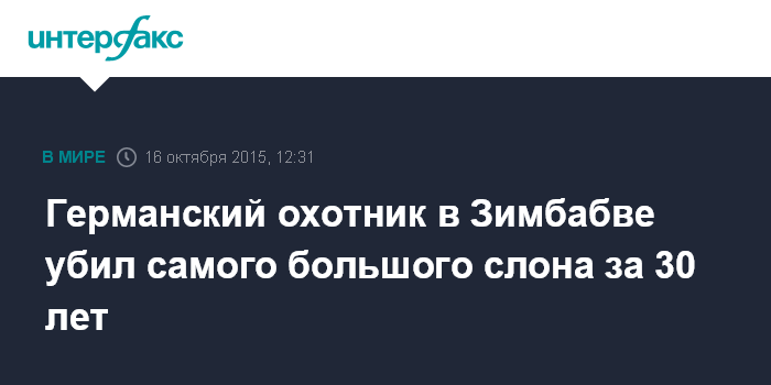 Москва. 16 октября. INTERFAX.RU - В Зимбабве в национальном парке Гонарежу охотником из Германии был застрелен самый большой слон за последние 30 лет, сообщает в пятницу британская газета The Daily Telegraph.