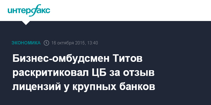 Москва. 16 октября. INTERFAX.RU – Отзывы лицензий и применение процедуры санации по отношению к банкам, имеющим большие депозитные портфели юрлиц, негативно сказываются на российском бизнесе, особенно на субъектах малого и среднего предпринимательства, считает уполномоченный при президенте по защите прав предпринимателей Борис Титов.
