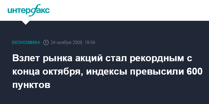 Москва. 24 ноября. INTERFAX.RU - Российский рынок акций в понедельник продемонстрировал существенный скачок большинства blue chips следом за мировыми фондовыми площадками и нефтью на новостях о господдержке американской Citigroup; индексы бирж РТС и ФБ ММВБ превысили отметку 600 пунктов, причем взлет стал рекордным с конца октября.