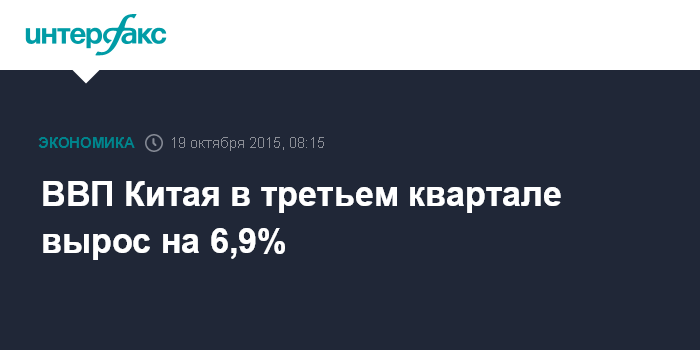 Москва. 19 октября. INTERFAX.RU - Рост экономики Китая в третьем квартале 2015 года составил 6,9%, снизившись по сравнению со вторым кварталом (+7%), но превзойдя ожидания экспертов, ожидавших рост на 6,8%, сообщает агентство Bloomberg.