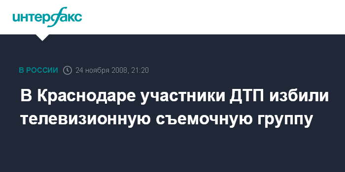 Москва. 24 ноября. INTERFAX.RU - В Краснодаре в понедельник вечером съемочная группа телеканала "Краснодар-плюс" пострадала от участников ДТП, которое приехали снимать телевизионщики. "Участники ДТП на автомобиле "Хендай-Соната" сначала потребовали, чтобы оператор прекратил съемку, а затем набросились на него, начали бить, отобрали кассету и штатив", - сообщила агентству "Интерфакс-Юг" главный редактор телеканала Татьяна Панасюк.