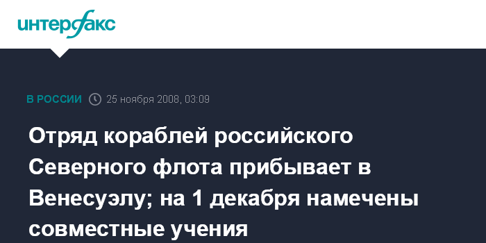 Москва. 25 ноября. ИНТЕРФАКС-АВН - Визит отряда боевых кораблей Северного флота российского ВМФ в венесуэльский порт Ла-Гуэйра начнется во вторник.