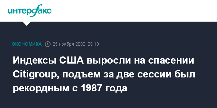 Индексы США выросли на спасении Citigroup, подъем за две сессии был рекордным с 1987 года