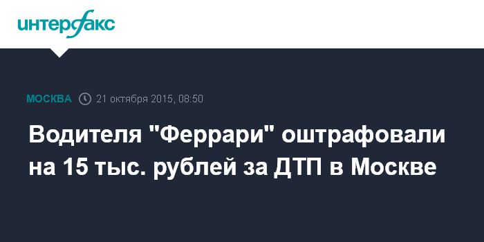 Москва. 21 октября. INTERFAX.RU - Находившийся за рулем "Феррари" молодой человек, устроивший в минувшую пятницу ДТП возле Крымского моста в центре Москвы, оштрафован на 15 тыс. рублей за езду без прав. Об этом сообщил "Интерфаксу" в среду руководитель пресс-службы столичного главка полиции Андрей Галиакберов.