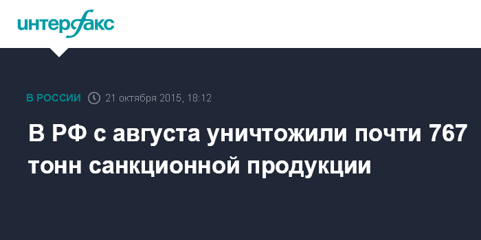 Москва. 21 октября. INTERFAX.RU - В России с 6 августа по 21 октября было уничтожено 766,876 тонны санкционной продукции, сообщили "Интерфаксу" в Россельхознадзоре.
