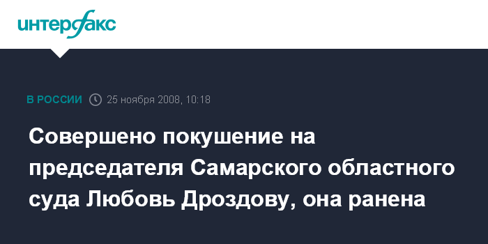 "Дроздова получила ранение в область живота и в настоящее время находится в больнице", - сказала представитель следственного управления. По ее информации, покушение на председателя областного суда было совершено в 8-30 местного времени.