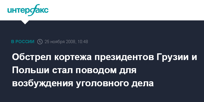 Москва. 25 ноября. INTERFAX.RU - МВД Грузии возбудило уголовное дело в связи с фактом обстрела 23 ноября у границы с Южной Осетией кортежа, в котором находились президенты Грузии и Польши - Михаил Саакашвили и Лех Качиньски.