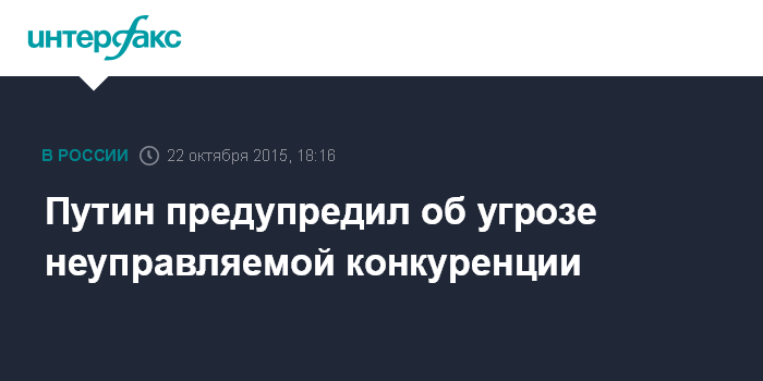 "Что неуправляемая конкуренция может означать для сферы международной безопасности? Это рост числа локальных конфликтов, особенно в пограничных регионах, где сталкиваются интересы крупных держав или блоков, это также вероятный закат системы нераспространения оружия массового уничтожения, что считаю чрезвычайно опасным, и, как результат, новый виток гонки вооружений", - сказал Путин, выступая в рамках дискуссионного клуба "Валдай".