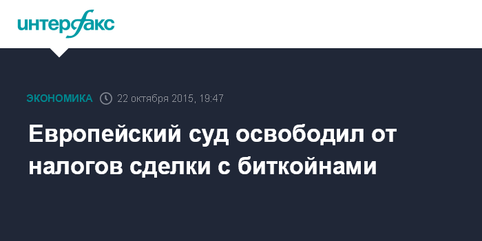 Москва. 22 октября. INTERFAX.RU - Европейский суд постановил, что операции с биткойнами и другими виртуальными валютами на территории Евросоюза не должны облагаться налогом на добавленную стоимость, говорится в заявлении суда. Такое решение суда приравнивает виртуальные валюты к традиционным валютам в плане налогообложения, пишет газета The Wall Street Journal.