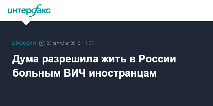 Москва. 23 октября. INTERFAX.RU - Госдума в пятницу приняла в первом чтении законопроект, отменяющий запрет на проживание в РФ ВИЧ-инфицированных иностранцев или лиц без гражданства, имеющих родственников - граждан РФ.
