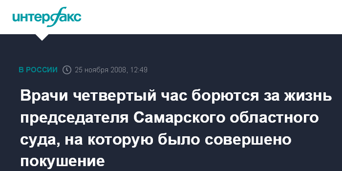 Врачи четвертый час борются за жизнь председателя Самарского областного суда, на которую было совершено покушение