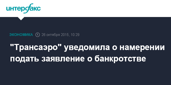 Москва. 26 октября. INTERFAX.RU - Авиакомпания "Трансаэро" в лице гендиректора Дмитрия Сапрыкина уведомила о намерении обратиться в арбитражный суд с заявлением о признании банкротом, следует из информации Единого федерального реестра сведений о фактах деятельности юрлиц.